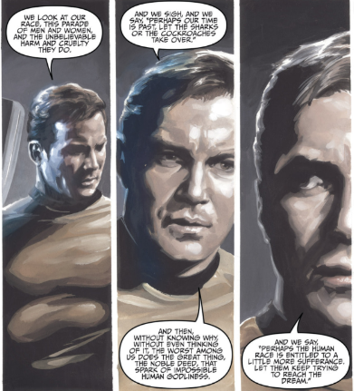 But for those of you who don't know the episode, lemme give a synopsis. A member of the Enterprise, due to some shenanigans that differ highly from each version of the story (This is the major change) ends up trying to flee onto a seemingly abandoned planet and ends up finding a way to time travel, leaping without knowing into Depression Era America. His presence causes the butterfly effect you would expect. Kirk and Spock go a bit further into the past before him to stop him when he shows up. The main conflict of the story is Kirk starting to go native, falling in love with a woman in the past and all the drama that comes from that. It's great classic sci-fi drama in both the episode and this comic. The speeches are as grandiose as you would expect and it's a trope of the era that I love, as a writer of overwrought monologues myself.