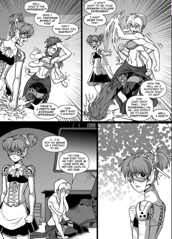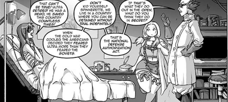 The main conceit of Spinnerette is a girl gets Spider-powers but in this case gains 4 extra arms and shoots webbing out of her ass instead of her wrist. From there for the first few issues it becomes a typical self aware origin story of her becoming...the third best hero in Ohio. She ends up joining the already established duo of Tiger and Mecha Maid. Now Mecha Maid is where this story begins to shift a bit, not just because she's a more interesting character than Spinny herself, being a Korean woman with ALS that ends up developing a mecha suit for herself to try to change the world into one that won't use her inventions as weapons before she dies in the next few years. But also because she ends up becoming Spinny's love interest, which pulls the story in a cool queer direction since despite the straight man-ness of some of the sexualization of the characters the depiction of these two figuring themselves out, especially as Spinny herself never really thought of herself as gay before meeting Mecha Maid, is genuinely really well done and their relationship continues to be a highlight. There's also a bunch of fun superhero shenanigans as well, especially with a "villain" called Dr. Universe who was a scientist who wanted to help humanity until the US government imprisoned him, and that, alongside only having Ayn Rand novels to read while imprisoned drives him in a not necessarily evil but much more pragmatic direction in a way that conflicts with the heroes' morality.