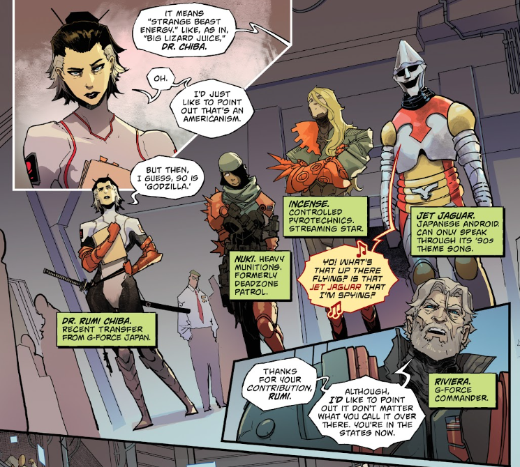 The first scene of the comic is a monologue describing how much like the 1954 movie Godzilla came out of the sea and destroyed Tokyo. However unlike the ending of that movie where Godzilla is successfully killed thanks to Dr. Serizawa there was no solution here. Godzilla just left and kept coming back. And well, since this is an American comic Godzilla is not just content with Japan, he also takes chunks out of America. As the explanation continues the person giving the monologue, Captain Rivera of the G-force unit in America, explains that Kai Sei Energy translates to Strange Beast Energy. A new recruit to G-Force USA, a Dr. Rumi Chiba, clarifies that that’s an Americanism. Though she quickly gives up any fight this may have led to by conceding that Godzilla is an Americanism too. This perfectly sets up the conflict at the heart of the book, at least the political one. It’s very much an examination of the mindset of America as a whole. Particularly how quick the countries leaders (And some of its citizens) are to place all anger and dreams of revenge on anything but themselves. Specifically it’s a look at America’s post 9/11 response. Yes lives were lost but America uses it to capitalize on it’s own bloodlust rather than actually trying to stop the violence. A contrast to what Dr. Rumi at least claims is Japan’s way, which is understanding with the monsters, to treat them more like natural disasters rather than something to project rage and anger onto. This ties back to Ishiro Honda’s philosophy when it comes to Kaiju, that there should be some amount of understanding and pity.