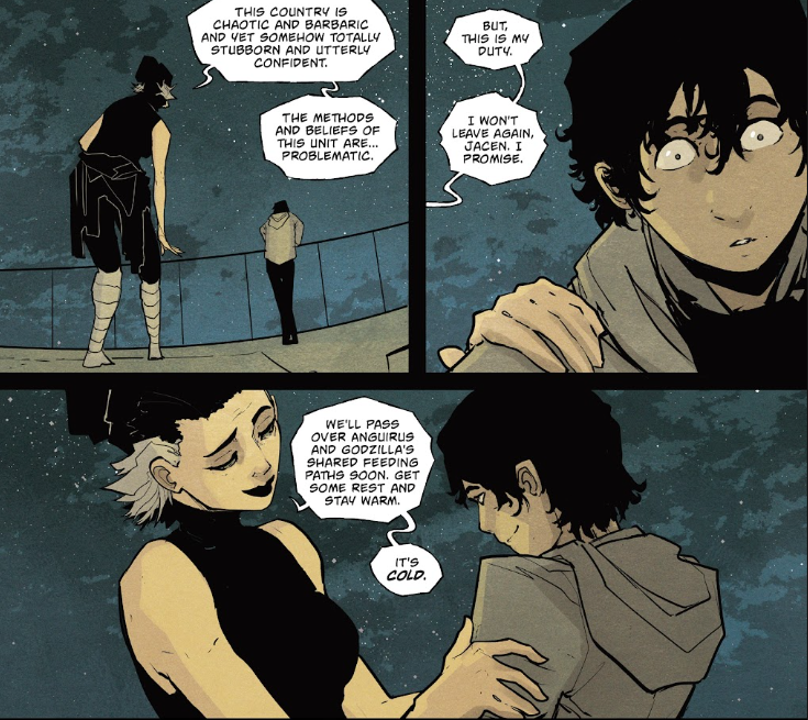 The first scene of the book continues to show footage of a boy who is blasted by Godzilla and instead of dying is able to absorb the beast’s energy and use it to power himself up full on anime style. This boy is called Jacen and he is the true protagonist of the book (Though within the first 6 issue arc I’m discussing here it can be argued and him and Rumi are Deuteroganists) and his journey of a more personal anger he deals with (His father dying of cancer and his mother being killed by Godzilla when he was young leaving him an orphan for most of his life will do that) perfectly compliments the larger story of America’s anger by making his a story of who and what we place our faith in when anger takes over. Who do we listen to, who are we loyal to when you’re not able to think decisions through? Very early on Jacen and Dr. Rumi form a sweet relationship with her being a much needed mother figure in his life. She teaches him about Japan’s way of dealing with the monsters and generally trying to help him get some sort of grounding as opposed to Captain Rivera mostly wanting to use him as a weapon.