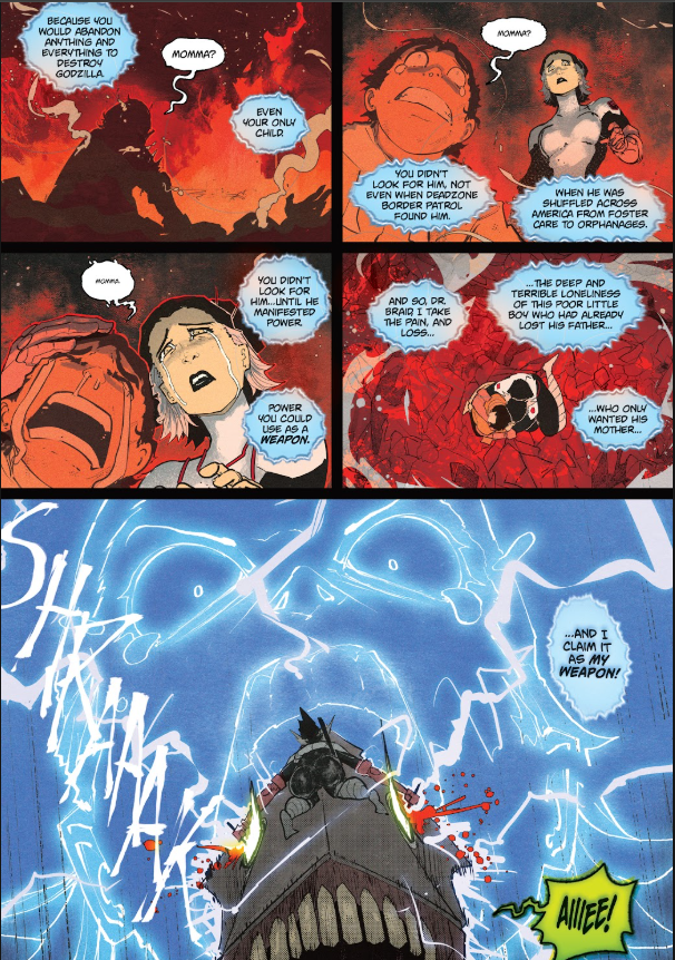 Nowhere is this more clearly stated than in the character of Lament, who brings some of these disparate ideas together. At the end of the first issue we see the silhouette of a giant kaiju, one that can talk and who clearly has nefarious plans. In issue 2 we learn about leeches that are super effective against Godzilla and the other Kaiju. By Issue 4 we learn that these were created by someone and that someone was Lament. Lament wants Godzilla dead at all costs. So does G-Force USA, so the bulk of the group (Minus Jacen and Dr. Rumi who are off doing other things) end up teaming up with Lament at first. Once Rumi and Jacen come back they knock some sense into their other team members. With Lament revealing that yeah, it was manipulating them mostly. But it really does want Godzilla dead. It wants Godzilla dead because it took her life from her. An attack by Godzilla when she was trying to study Kai-Sei energy to potentially get rid of her cancer (The same cancer that took her husband) left her damaged and mutated. She’s spent the rest of her time trying to kill Godzilla. This is the same attack that took away Jacen’s mother…Lament IS Jacen’s mother. This is enough for Jacen to fall back on old habits, forgetting everything Rumi tried to teach him and launch into a rage against Godzilla.